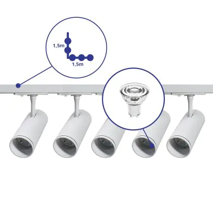 Bright Choice Complete Set 1-Phase Rail L 1,5 x 1,5 Meter White | incl. 5x Spot + GU10 2700K 3W Dimmable + End Cap, Power Connector and L -Connector